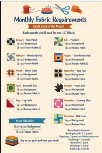 ● A Chicken Bucket was passed out in December 2025 and January 2026 and you are to label and add two yards of fabric into the bucket. You will swap buckets each month and make at least one 12-1/2’ block (or many) out of the fabric in someone else’s bucket. You may add additional fabric from your stash and we want you to put your skills to work. Paper piece, traditional piece, appliqué and use all your talents